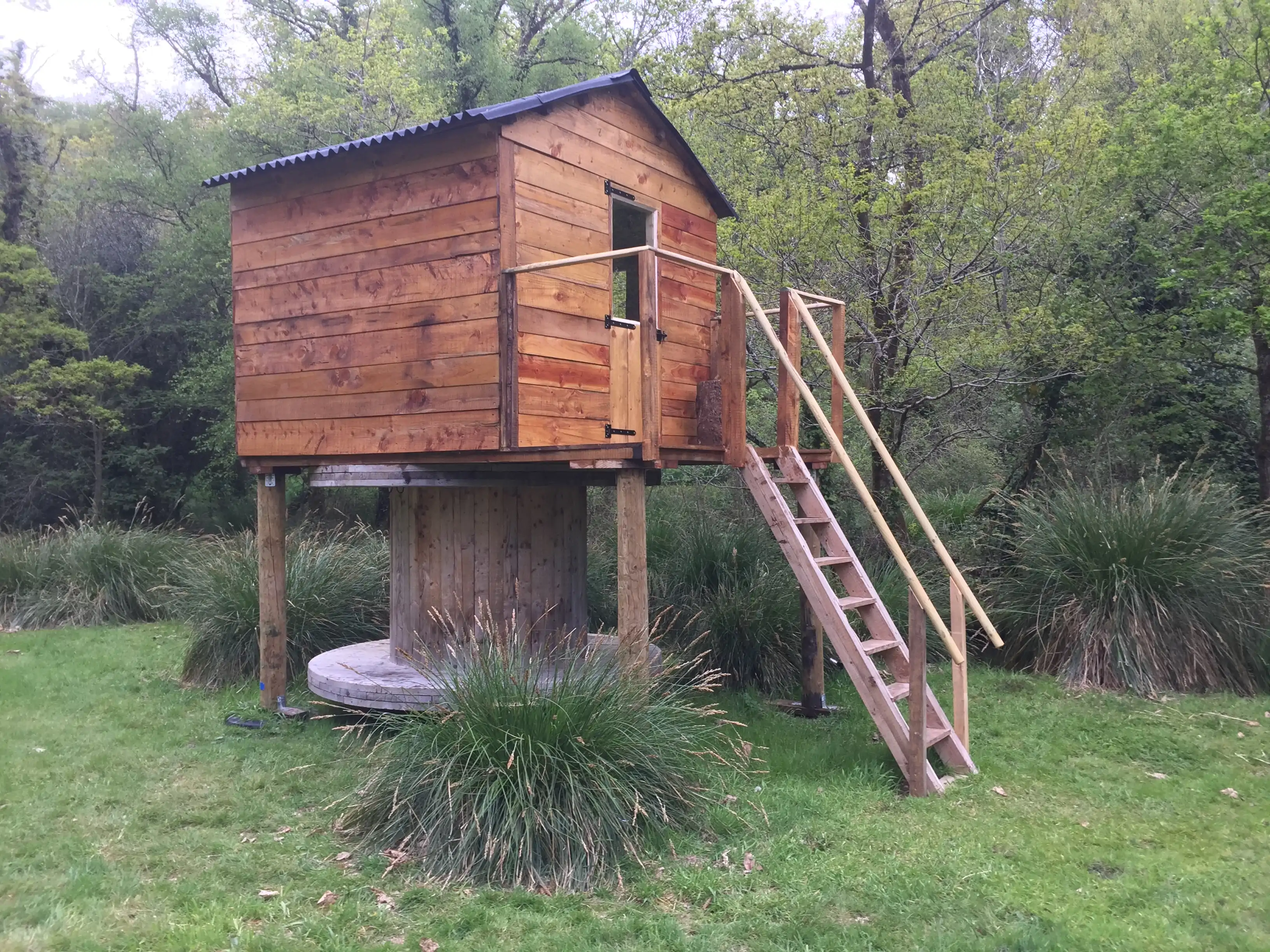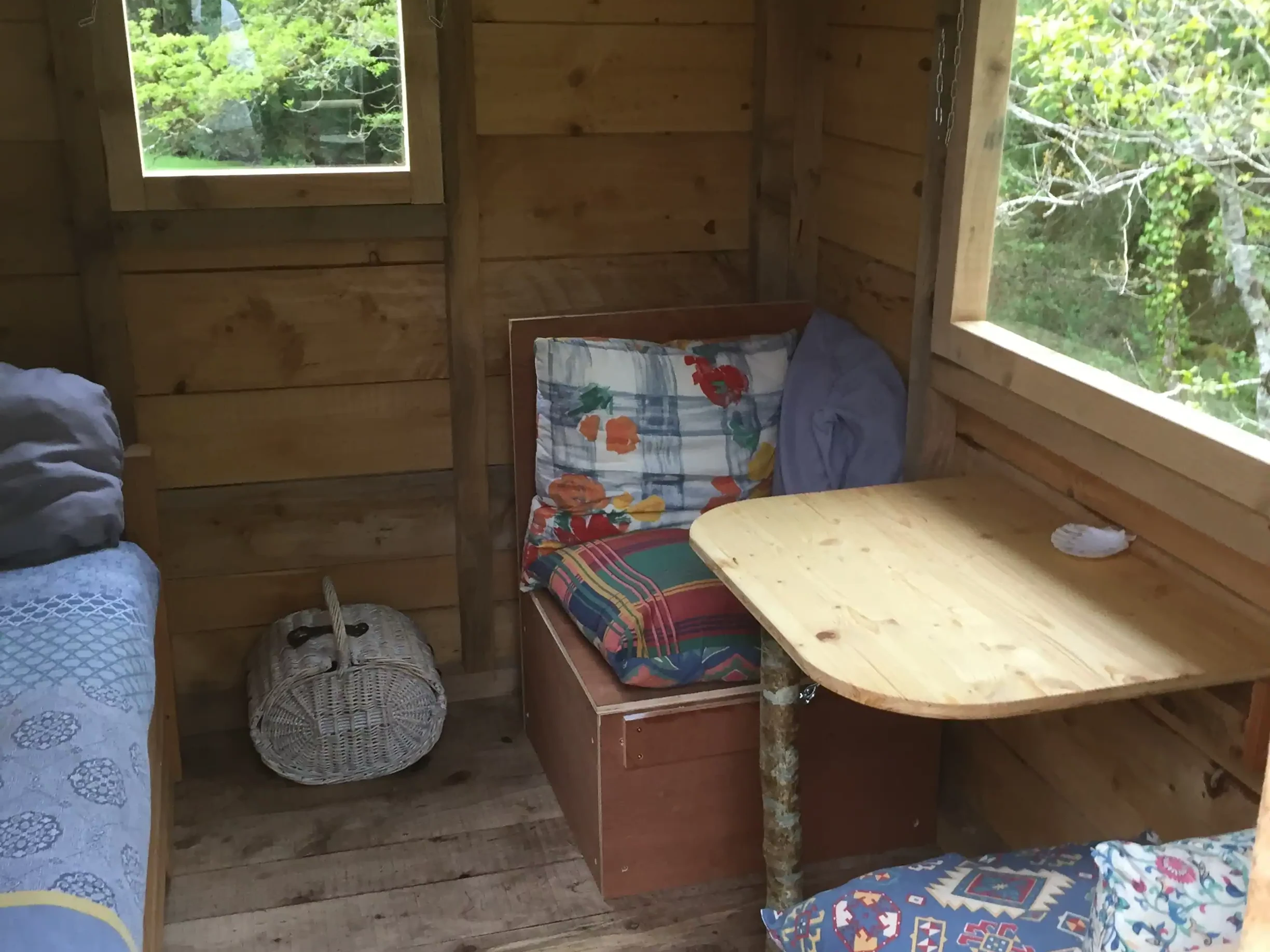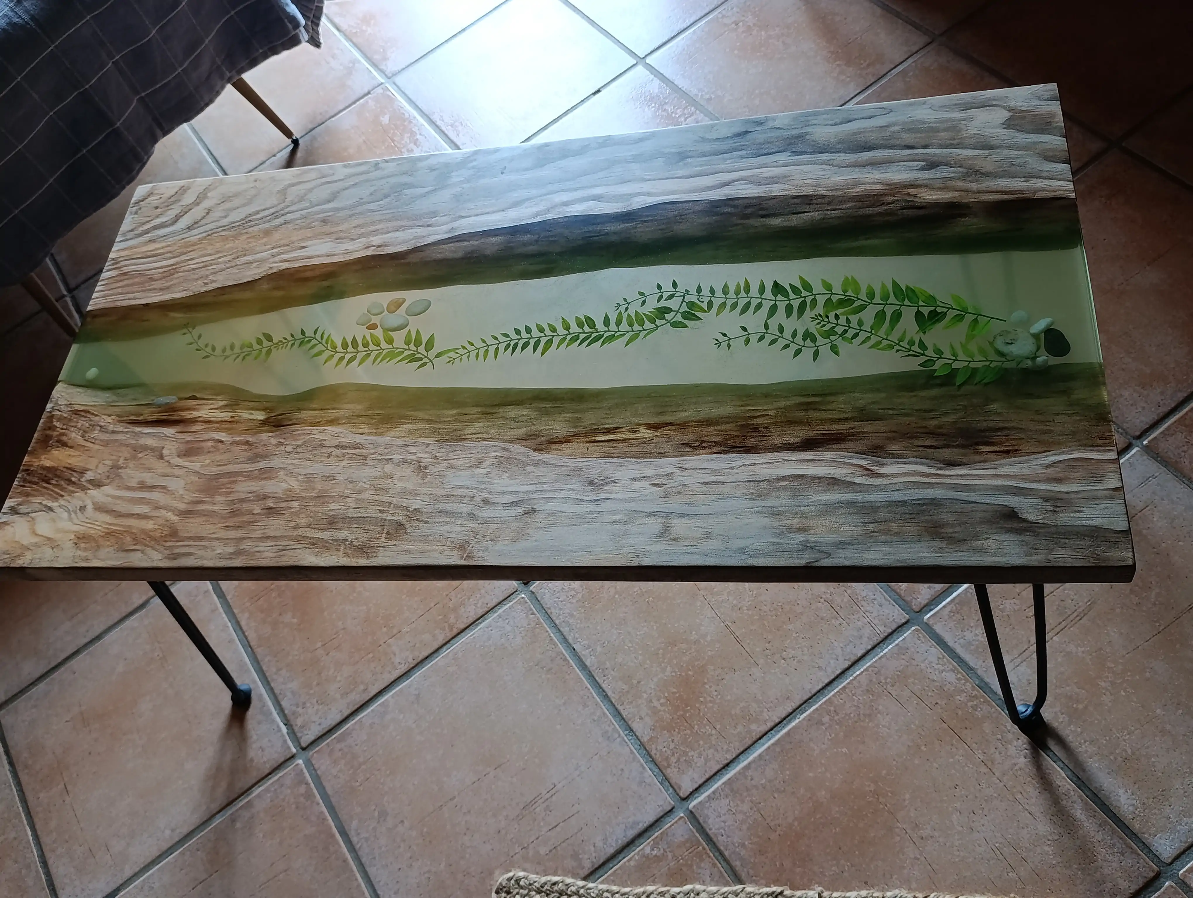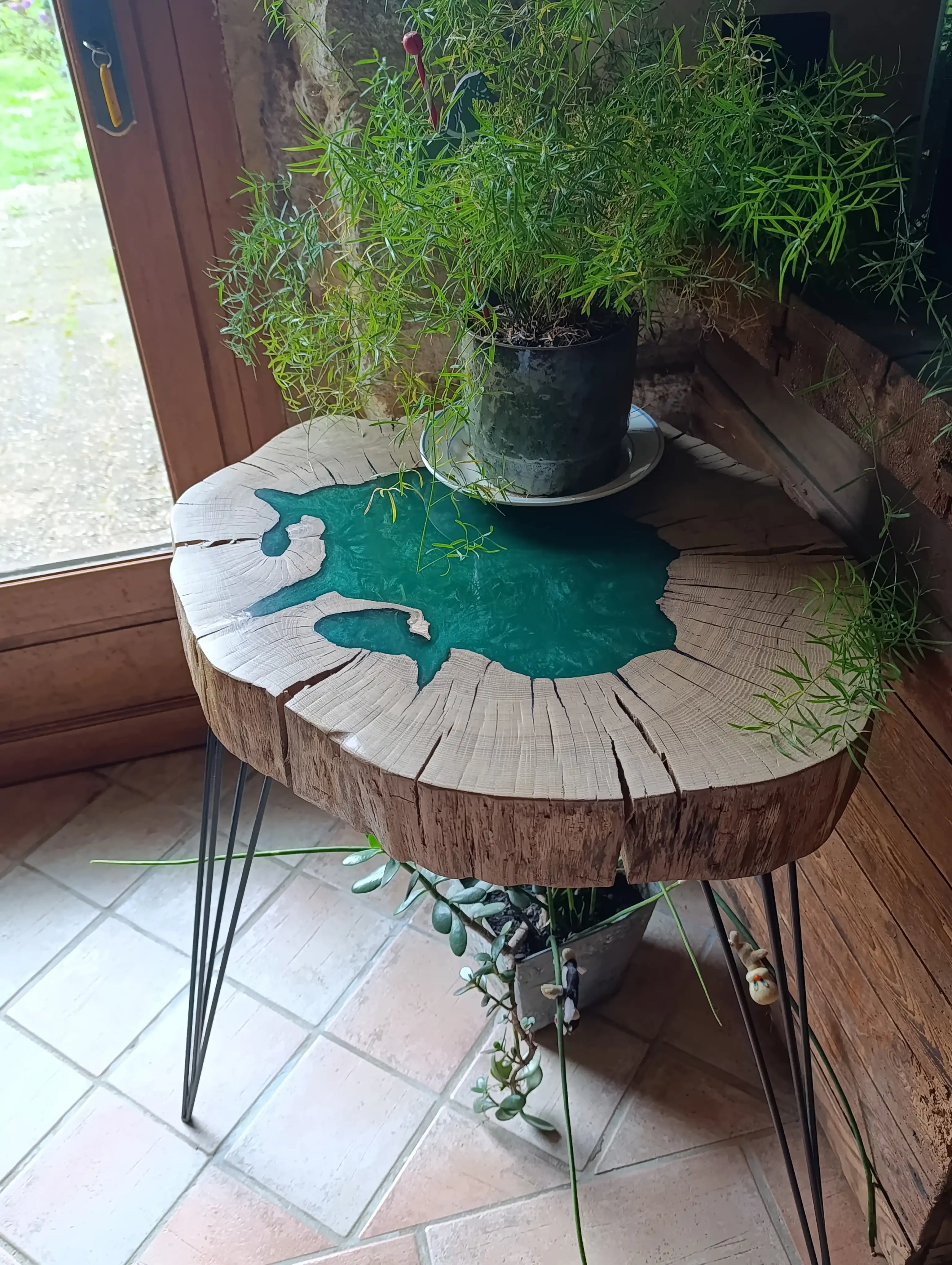 Table basse en pin maritime et époxy avec inclusions de pierres et végétaux. Piètement métallique noir. Prix: 700 euros