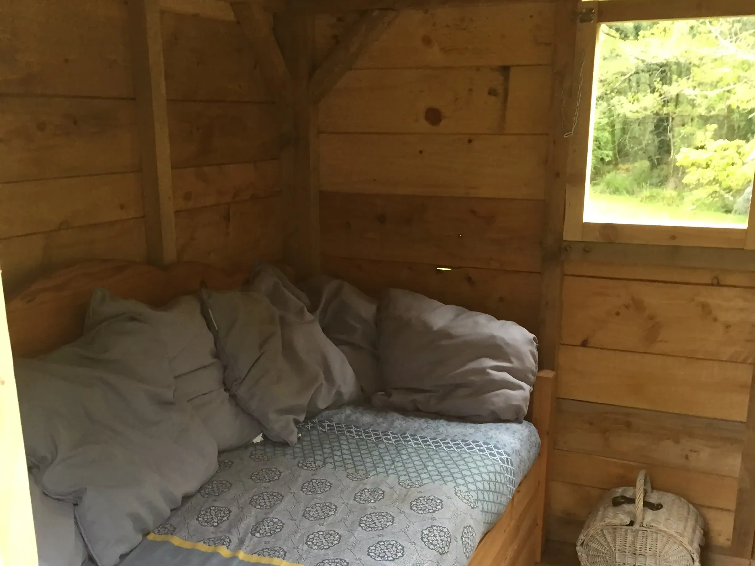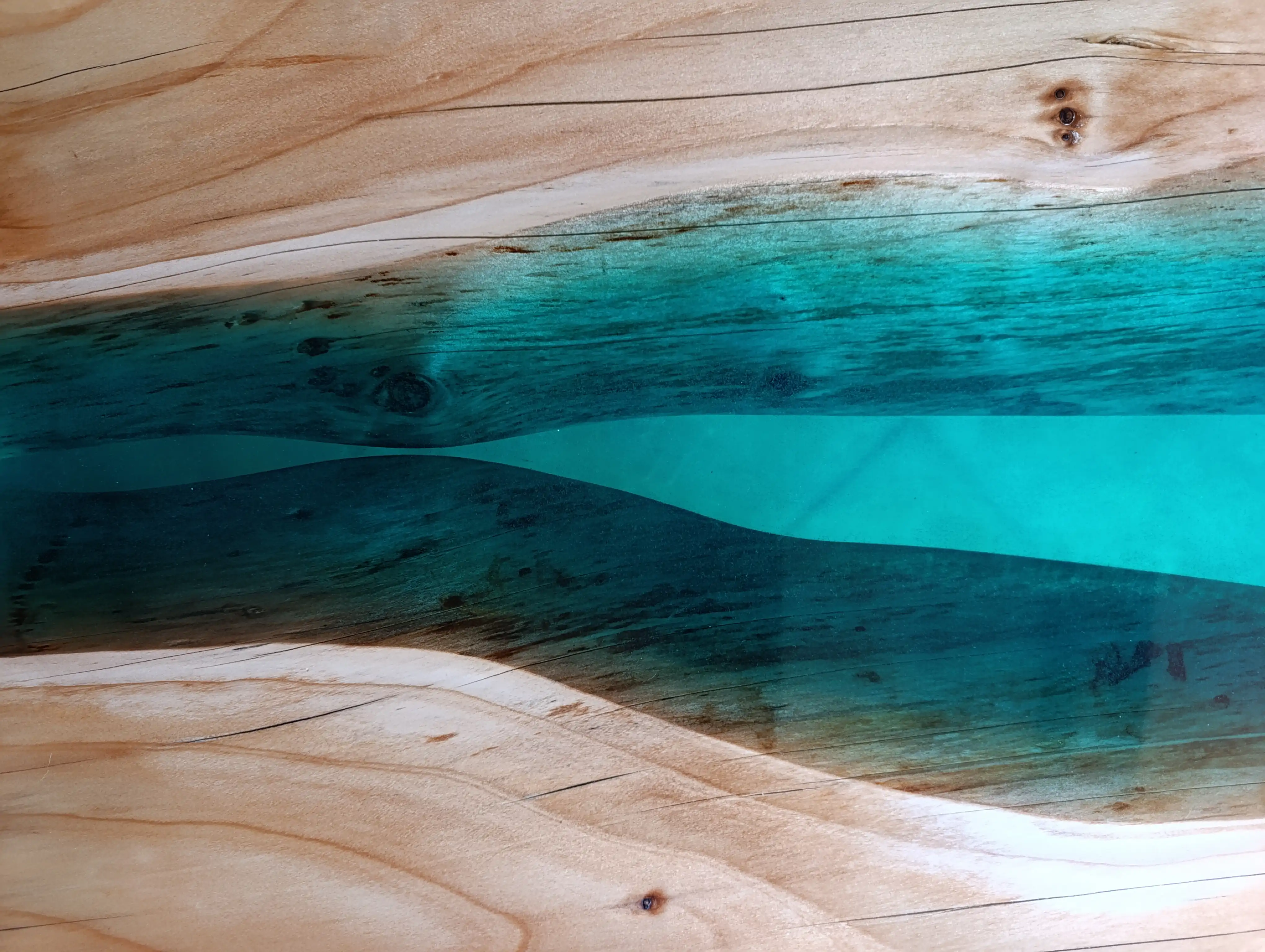 Table basse en pin et époxy translucide bleue turquoise. Vendue.