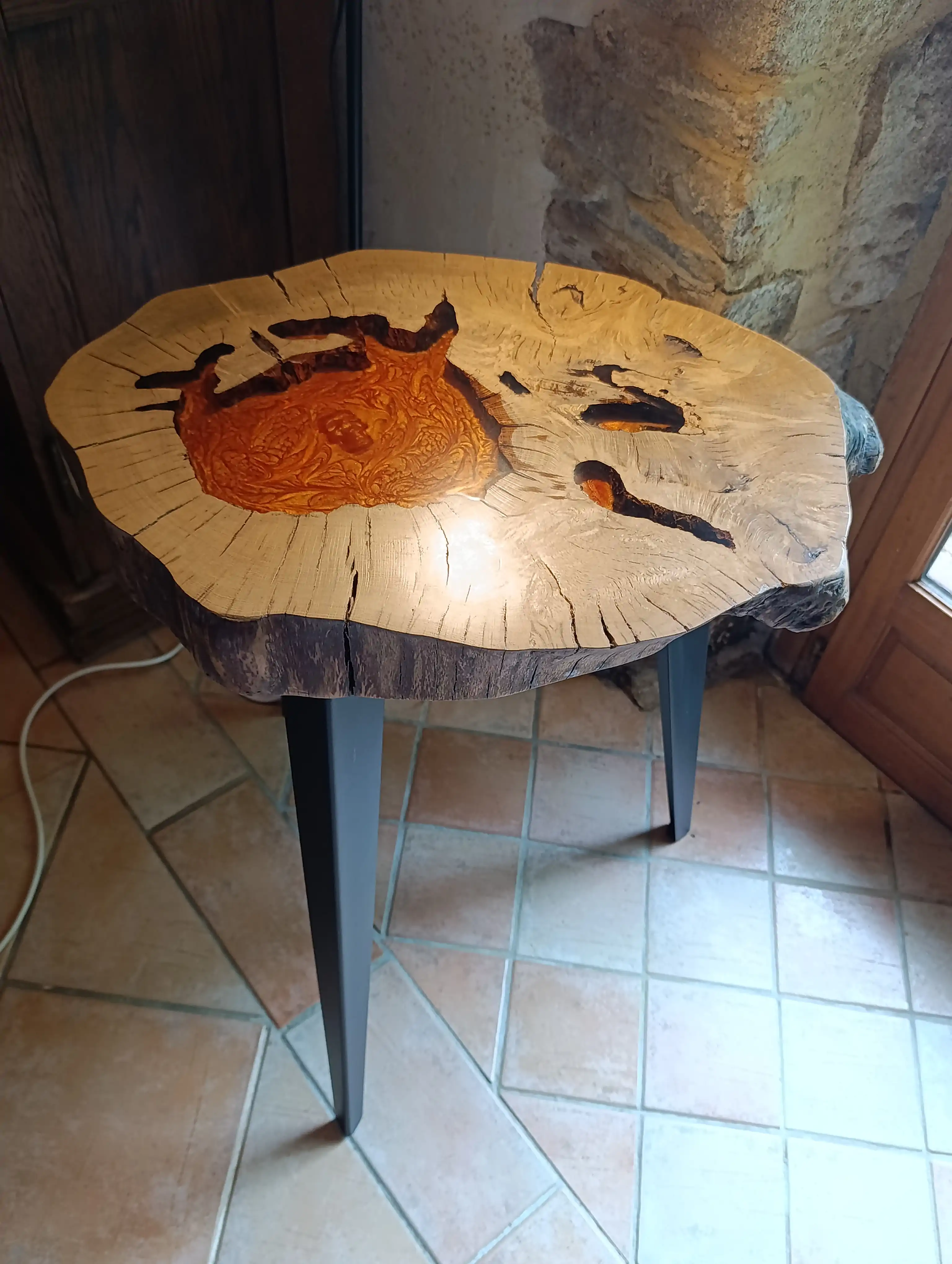 Table en chêne massif et époxy en effet lave avec inclusion d'une tête de mort; épaisseur 10 cm; piètement métallique noir mat. Prix: 750 euros